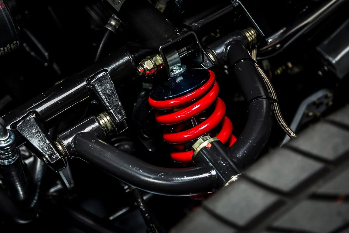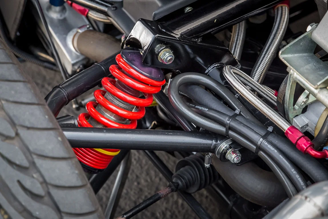 The front sports a fully independent unequal length A-arms with adjustable coils-over telescopic shock absorbers, while the rear is also independent unequal length A-arms, with fabricated hub carriers and coil-over shock absorbers.