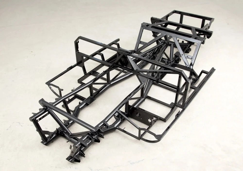 The chassis Jig-Welded parallel ladder frame of heavy wall round and rectangular steel tubing with large diameter outriggers. Frame incorporates front and rear crumple zones. Door hinge, steering column incorporated onto main chassis.